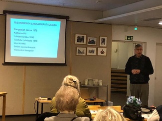 Kotiseutuneuvos Seppo Toivonen kertoi Lahden Kirkon (nyk. Ristinkirkko) sekä sankarihautausmmaan historiaa.